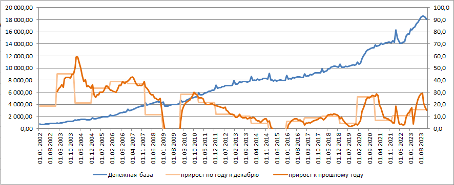 Только два периода было, когда деньги в обороте сокращались - 2009 и 2015 год. Это после кризисов 2008 и 2014 годов, которые пришлись на грузинскую войну и войну в ДНР, ЛНР и "Крым наш".