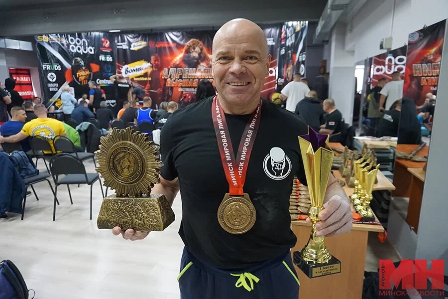 Более 150 участников из Беларуси и России собрал в Минске фестиваль силовых видов спорта «Адреналин. Высшая Лига» 24 декабря, передает корреспондент агентства «Минск-Новости». В течение дня богатыри разыграли 150 комплектов наград во всех видах программы. Среди них — подъем штанг на бицепс, жим штанги лежа, стритлифтинг, пауэрлифтинг, а также набирающий популярность белорусский жим гири. В этой дисциплине в преддверии турнира организаторы пообещали две зарубы. Так, Вячеславу Хоронеко вызов бросил силач из Мозыря Андрей Яцыно, а Виктору Мацуру — богатырь из Солигорска Евгений Жоров. И батл получился на славу. За несколько дней до турнира удалось пообщаться с В. Хоронеко. Оказывается, во время тренировки у него случилось растяжение связки груди. Легенда гиревого спорта переживал, что микротравма может повлиять на итоговый результат. Ведь ему на неделю пришлось приостановить тренировки. Тем более что в своей попытке А. Яцыно 32-килограммовую гирю за 5 минут выжал 84 раза. Похоже, это разз