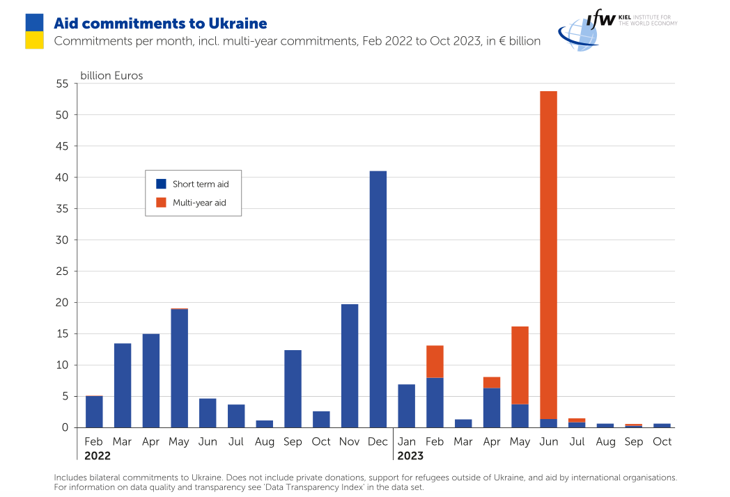 Недавно, я писал о занимательном исследовании значимого западного исследовательского центра - института мировой экономике в Киле (Германия). Если сложить данное исследование и ряд происходящих сигналов - можно прийти к интересным выводам о 2024 году. Важный график из исследования: Он явно показывает, что объемы финансовой помощи Украине снизились до исторически самых низких значений за весь период конфликта. И на этих около-нулевых уровнях находится уже с июля, особенно если сравнивать с предыдущими месяцами. Новые пакеты финансовой помощи тоже под вопросом. В США в Конгрессе не прошел пакет помощи на несколько десятков миллиардов. Байден выделил 200 миллионов, но в рамках прошлых пакетов - это смешная сумма, просто для галочки. ЕС тоже пока придержали свой многомиллиардный пакет. Да, что-то выделяться будет. Но объемы, аппетиты, а заодно и требования к расходованию средств явно ужесточаются. Если посмотреть на военную помощь, то тут тоже видно замедление. Это может говорить о том, чт