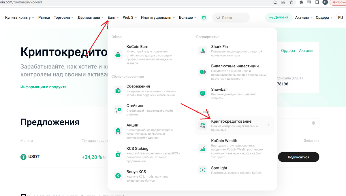 В этой статье я расскажу как можно вложить свои деньги под проценты, к тому же очень хорошие! Кто платит такие проценты? Давайте разберемся вначале откуда берутся эти проценты прибыли? Все очень просто! И прозрачно. Есть биржа, на которой торгуют пользователи, кто-то покупает, а кто-то продает, так вот, зачастую применяя заемные средства. И в этой статье я покажу как можно буквально в пару кликов дать деньги под проценты, а на момент написания статья они составляют порядка 35% годовых! Для начала надо зарегистрироваться на бирже криптовалют Далее перейти в раздел "Earn" --> "криптокредитование" (можно хоть с телефона, хоть с компьютера) : Далее в строке поиска вводим цифровой доллар USDT, и нажимаем "Подписаться": Указываем минимальную кредитную ставку, я указываю 5% (под какой процент вы готовые давать деньги в долг (годовая ставка)). Текущая кредитная APY - это какой текущий %, в зависимости от спроса он меняется, т.е. если много желающих занять денег но предложений мало - % увел