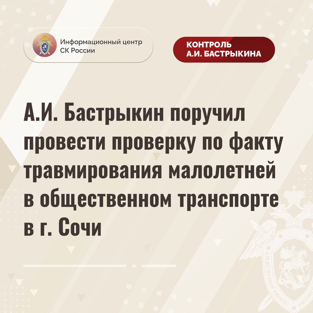 А.И. Бастрыкин поручил провести проверку по факту травмирования малолетней в общественном транспорте в г. Сочи