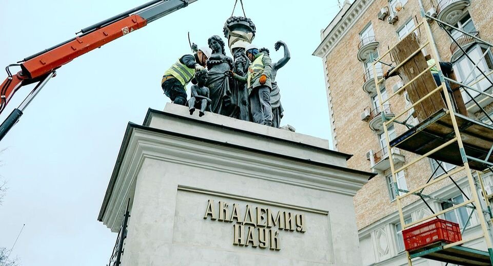 Глава города уточнил, что перед реставраторами стояла непростая задача, так как первоначальный облик скульптур «Времена года» можно было увидеть только на рисунке 1830 года. Затем композицию неоднократно видоизменяли. Специалисты, проанализировав все изображения, приняли решение воссоздать общую композицию въездных ворот со скульптурами по сложившемуся образу конца XIX — начала XX века. Это сохранившаяся подлинная левая скульптурная группа, представляющая собой шпиатр музеефицированный в помещениях Российской академии наук.