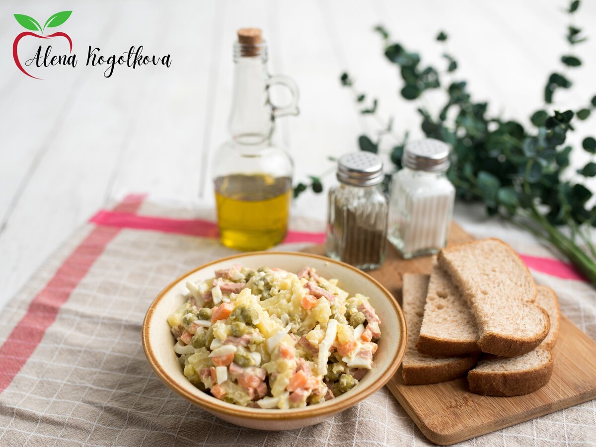 Но, как и в случае колбасы и майонеза, никто не препятствует тому, чтобы мы заменили консервированный горошек свежезамороженным. Будет ещё вкуснее.