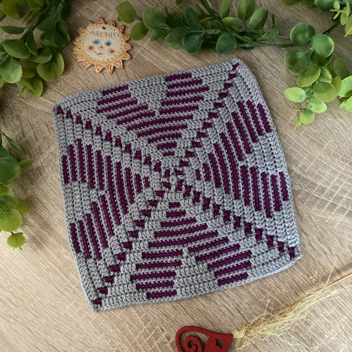 В этот раз решила провести эксперимент: в одном квадратном мотиве, связанном крючком попробовать "сочетать несочетаемое". Делюсь с Вами результатом, что в итоге у меня получилось. Есть так называемая "иллюзорная" техника вязания спицами, техника довольно интересная, очень эффектно смотрится, особенно на изделиях больших размеров. Но к моему сожалению, я не смогла найти (или плохо искала) есть ли аналог этой техники для вязания крючком. Плюс к этому, вместо прямого вязания хотела придумать схему для квадратного мотива. В итоге составила схему для мозаичного вязания крючком так, чтобы узор мотива хотя бы отдалённо напоминал "иллюзорное" вязание спицами. Для первого раза выбрала довольно простой рисунок. Узор мотива состоит из одного большого элемента (похож чем-то на схематическое "сердце"), рисунок как бы составлен из отдельных мелких элементов. Схема квадратного мозаичного мотива "Мистика" Условные обозначения к схеме Схема мотива получилась большая на 24 ряда, сам мотив, независимо