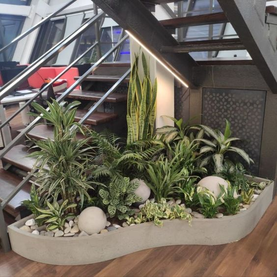 Решение: создать растительную композицию в поддоне из бетона неправильной формы. Материал выбран не случайно, его брутальная фактура завязывается в лофт-диалог со сварной металлической лестницей.