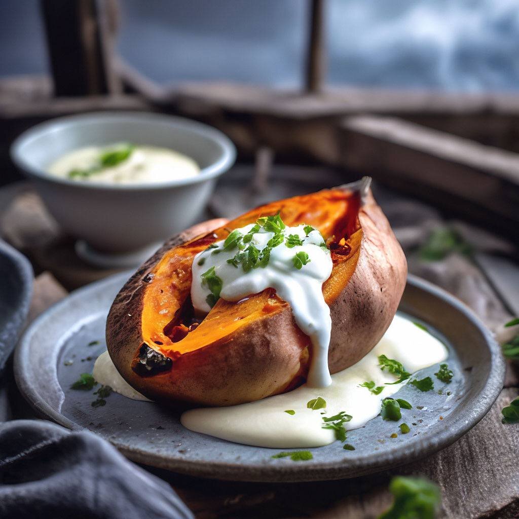 5. Пока бататы запекаются, приготовьте соус: в миске смешайте греческий йогурт, измельченный лук, соль и перец. Перемешайте, чтобы все ингредиенты хорошо соединились.