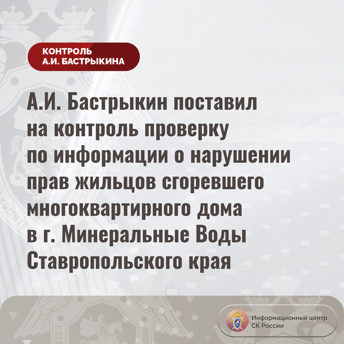 А.И. Бастрыкин поставил на контроль проверку по информации о нарушении прав жильцов сгоревшего многоквартирного дома в г. Минеральные Воды Ставропольского края
