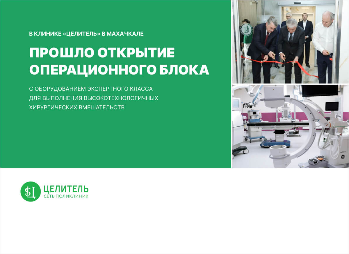 В медицинском центре "Целитель" в Махачкале открылся совершенно уникальный операционный блок, оснащённый самым современным медицинским оборудованием, не имеющий аналогов на Северном Кавказе. Он находится в основном здании клиники и представляет собой семь отделений, занимающих общую площадь 1400 квадратных метров. Здесь установлена новейшая техника от известных мировых производителей медицинского оснащения, дающая возможность осуществлять до 600 сложных хирургических вмешательств в месяц в таких сферах, как: Создание комфортных и безопасных условий для пациентов в "Целителе" являются приоритетом. Поэтому операционная оснащена инновационной системой вентиляции, обеспечивающей максимальную защиту от нежелательных микроорганизмов и, кроме того, поддерживает постоянный температурный режим в помещении. Осветительные приборы над операционными столами оборудованы видеокамерами для записи операций и передачи информации в реальном времени. Мониторы оборудованы специальной защитой, в том чис