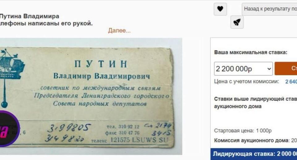На сайте одного из аукционов недавно появился интересный лот — визитная карточка Владимира Путина, напечатанная в 1990-х годах в период, когда будущий президент России был советником по международным связям Председателя Ленсовета. На карточке Путин собственноручно написал номера телефонов. Стартовая цена лота была небольшой — всего 1000 руб, однако уже вчера за визитку готовы были отдать несколько сотен тысяч руб. Сегодня же визитка Путина с учетом комиссии стоит уже больше 2 млн руб. читайте также: Студентам колледжа «Энергия» рассказали о семейных новогодних традициях Стань другом нашего канала Яндекс.Дзен