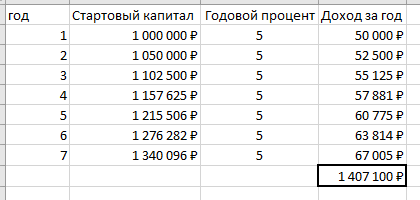 За 7 лет мы получаем всего 1 407 100р, т.е. прирост капитала с учётом сложного процента составил всего 407 т.р. с хвостиком или 40%, что как бы логично.