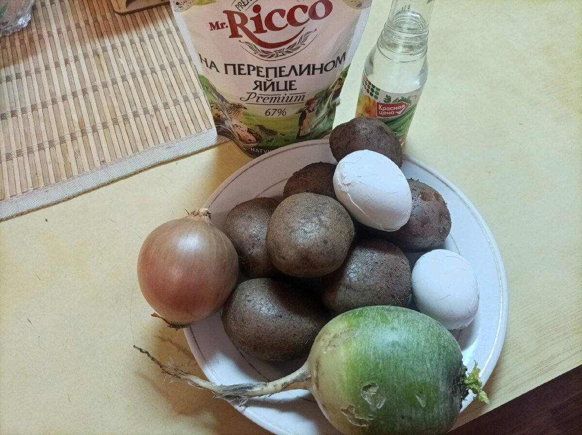 Продукты – редька, подойдет любая, черная или зеленая Маргелланская, дайкон. Картофель, куриные яйца, лук репчатый, зелень (укроп, петрушка, лук зеленый), вода или квас, уксус, майонез или сметана.