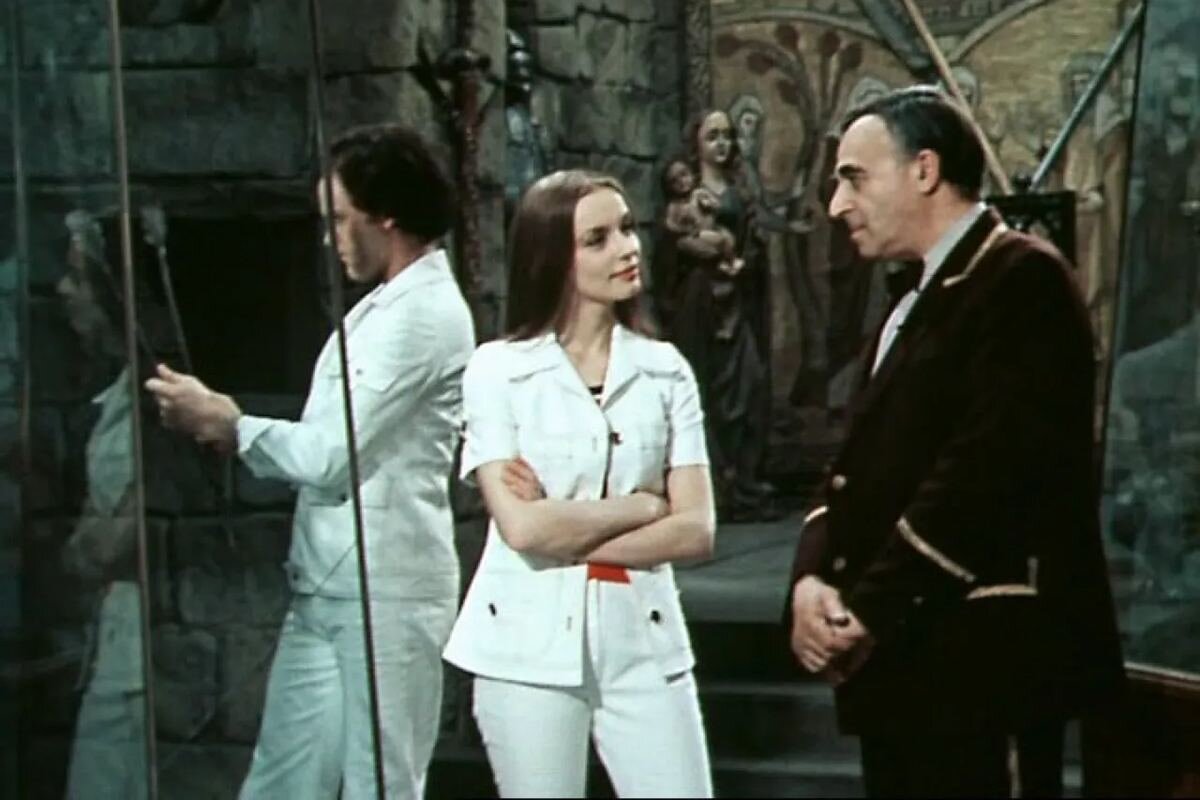 Увы, в киноверсии все они заменены не самыми яркими танцевальными номерами с артистами балета и утомительными песнями (музыка Александра Зацепина, стихи Леонида Дербенева, Риммы Казаковой и Юрия Энтина), снятыми в унылом павильоне. Сюжет как будто похож, но он обозначен пунктирно и словно не очень интересует Квинихидзе, в отличие от песен и плясок. Сыгравшие главные роли Наталья Трубникова и Николай Еременко-младший не то чтобы очень стараются, сцены в прошлом и будущем похожи на репетиции актеров погорелого театра, да и вообще весь просмотр тяжело отделаться от чувства неловкости за происходящее. Ситуацию не спасают даже Владимир Этуш в колоритном образе Мальгрима и Владимир Зельдин сразу в двух ролях (король Перадора и глава рекламного агентства Диммок). Разве что стоит отметить Любовь Полищук, натертую ваксой и поющую голосом Жанны Рождественской, и переозвученного балеруна Александра Годунова, буквально на следующий год сбежавшего в США. Кстати, именно этот факт, а также скорый отъезд на ПМЖ во Францию композитора Зацепина стали причиной того, что фильм лег на полку на долгие 7 лет. Потом Квинихидзе вновь вернется к жанру мюзикла в «Мэри Поппинс, до свидания!» — надо сказать, с намного большим успехом.
