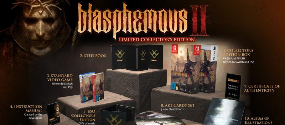 Издатель и дистрибьютор Selecta Play раскрыл содержание коллекционного издания Blasphemous 2, выход которого запланирован для PlayStation 5 и Nintendo Switch в начале 2024 года. Коллекционное издание будет поставляться в коллекционной коробке, которая будет включать в себя: стилбук с эксклюзивным артом, благодарственное письмо от студии, металлическая монета Marca del Martitio, три арт-карты с иллюстрациями, два диска с музыкой из игры в коллекционном футляре, код для загрузки цифрового саундтрека игры, руководство по игре с более чем 60 страницами истории о Blasphemous, альбом с иллюстрациями и сертификат подлинности.