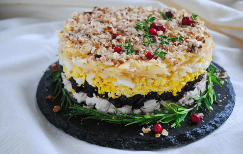 Ингредиенты: Мяса индейки (можно заменить на куриную грудку) – 300 г. Яйца – 5 шт. Чернослив - 150г Сыра и грецких орехов – по 100 г. Майонез и соль. Приготовление: 1. Мясо птицы отварить в подсоленной воде с лавровым листом и душистым перцем. 2.Остывшее филе мелко порезать. 3. Также измельчить чернослив. 4.Орехи слегка поджарить на сухой сковороде, измельчить в блендере и смешать с черносливом. 5.У охлажденных вареных яиц отделить белки от желтков и потереть на мельчайшей терке в разные сосуды. Сыр тоже потереть довольно мелко. 6.Для уборки салата на плоскую тарелку выложить мясо, присолить при необходимости и смазать соусом. Далее следует слой желтков и промазка из майонеза, затем чернослив с орехами плюс майонез, а затем творог и соус. 7.Готовый новогодний салат засыпать яичным белком. Салату дать постоять в прохладе полчаса. Приятного аппетита! #салат Кулинарные рецепты на каждый день