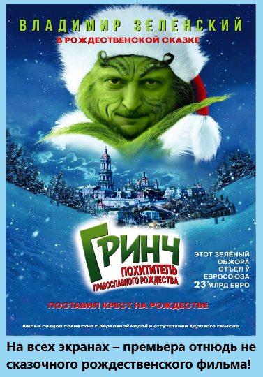 Дорогие мои друзья-соратники, если среди вас есть те, кто исповедует католическую конфессию, то я от души поздравляю их с католическим Рождеством! Ибо ничего против католиков не имею от слова совсем. Как и против мусульман и буддистов. Правда, немало чего против имею я в отношении тех, кто предает религию земли своей и веру своего народа. Да еще и принуждают к этому других людей А такие не только имеются на соседствующем с нами чрезвычайно незалежнем государстве, но еще и правят страной Вот этот зеленый Гринч украл у детей Деда Мороза, у взрослых - православное Рождество, а у европейцев 23 миллиарда евро. И так уж получилось, что ренегатство не приносит добрых плодов. а также хороших подарков. США, к примеру, резко снизили объем финансирования всех хотелок незалежнего государства, хотя тамошний президент и ножкой топал, и истерики устраивал - словом, вел себя как чрезвычайно капризное и избалованное дитятя Но не помогло. Санта Клаус не внял его слезным просьбицам И вот США предоставляю