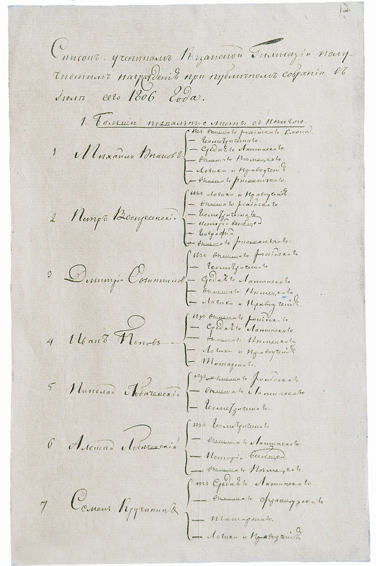 Собрание Совета Казанской гимназии рассмотрело список учеников гимназии, прошедших испытание, и допустило их к слушанию профессорских и адъюнктских лекция в университете. Среди учеников, будущий ректор университета Н.И. Лобачевский: 1.Сергей Градовский 16 лет