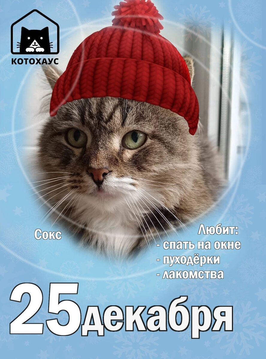 #Новогоднее_Чудо_сКХ отмечает в календарике 2⃣5⃣декабря! ☃❄🎅 А на помощь к нам спешит Сокс! Сокс настоящий сибиряк! Он мог легко бы стать главным помощником Деда Мороза и Снегурочки, ведь всё при нем: пушистая шубка, очарование и любопытство! Сокс очень скромен, поэтому мы попросим за него - Дед Мороз и Снегурочка, Сокс очень хочет домой, подарите ему самый главный подарок в его жизни! А пока вы можете вручить ему и его друзьям подарочки под елку (если что мы вам не подсказывали!🤫🤭): ❄ Пакетик вкусного корма на новогодний стол. 🥫🍽 ❄Игрушку под елку, чтобы не скучать 🪁 ❄Лекарства, чтобы не болеть в новом году ❄Средство для уборки, чтобы встретить Новый Год в чистоте 🧼🧽 ❄Самый главный подарок, который ждут все каждый день - обрести свою семью...👨👩👧🐈 Пишите в комментариях или в сообщения сообщества, что вы готовы подарить Соксу и его друзьям! Вы можете привезти подарки лично и побывать в гостях или же заказать их на адрес приюта: 💝Будапештская, д. 36, к. 2,