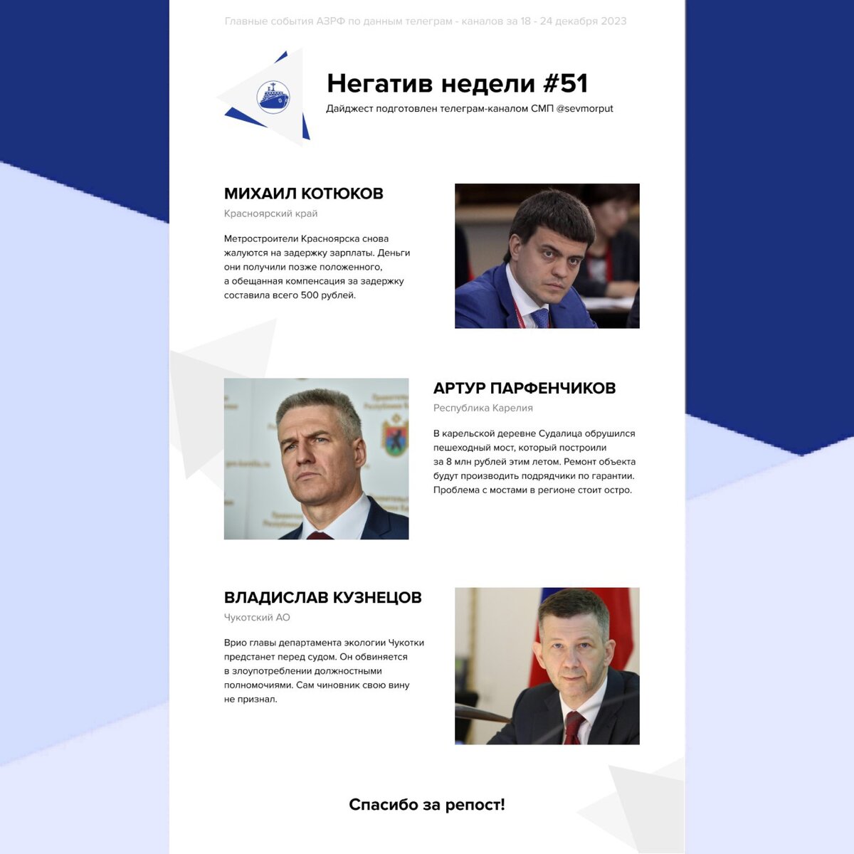 Представляем еженедельный рейтинг «Главы АЗРФ — Негатив недели. Неделя 51» Михаил Котюков Метростроители Красноярска снова жалуются на задержку зарплаты. Деньги они получили позже положенного, а обещанная компенсация за задержку составила всего 500 рублей. Дело обстоит так, что Красноярский край вовремя перечисляет средства за работы, а генподрядчик и субподрядчик винят в сложившейся ситуации друг друга. Напомним, сейчас строительство метротрама частично приостановлено из-за ожидания госэкспертизы. Часть рабочих на стройке Красноярского метротрама отправили в вынужденные отпуска. Артур Парфенчиков В карельской деревне Судалица обрушился пешеходный мост, который построили за 8 млн рублей этим летом. Ремонт объекта будут производить подрядчики по гарантии. Строительной бригаде предстоит демонтировать повреждённые конструкции в течение двух недель. Стоит отметить, что в Карелии остро стоит проблема нехватки мостов. Так, в одном из поселков женщину с инсультом пришлось везти до машины ск