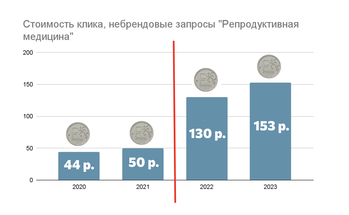 Вот как по нашему опыту менялась стоимость клика в Директе в категории «Репродуктивная медицина» с 2020 по 2023 год. Просто посмотрите, какой скачок в цене с 2021 по 2022 год!