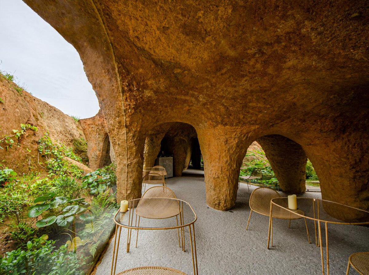 Этот необычный дом и ресторан под землей в небольшом японском городке был создан бюро Junya Ishigami + Associates. На воплощение задумки архитектора ушло целых 9 лет. Весь дом находится ниже уровня земли, с улицы видно лишь бетонную плоскую крышу сооружения. Архитектор предложил очень необычный способ строительства: сначала были выкопаны глубокие ямы, которые залили бетоном, затем пространство вокруг получившихся столбов очистили от земли, благодаря чему получилось пещеристое пространство общей площадью около 200 кв. метров. Жилая зона и зона ресторана разделены несколькими внутренними двориками. В жилой зоне располагаются две спальни, гостиная-столовая, кухня, ванная комната. В ресторане 5 мест за барной стойкой и 12 небольших столиков.