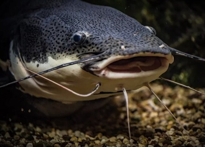 Эта крупная пресноводная бесчешуйчатая рыба имеет на подбородке две пары коротких усов, а на верхней губе - пару длинных, по которым ее легко отличить. Другие черты этой рыбы столь же необычны. Спинной плавник сома очень короткий, сильно сдвинут к голове и расположен над грудными плавниками. Хвост, сильно сплющенный с боков, занимает более половины всего тела. Нижняя челюсть огромной закруглённой пасти длиннее верхней и загибается вверх. На челюстях и нёбе сома расположены мелкие многочисленные зубы в виде щеток. Сом неповоротлив и ленив, поэтому часто во время охоты прибегает к хитростям. Он устраивается на мели, где снуют мальки, и лежит неподвижно, полураскрыв свою огромную пасть. Как только стайка приблизится, сом втягивает воду, и десятки рыбок попадают в его пасть. Притаившись за камнем или корягой, хищник выставляет свои усы. Напоминающие червяков, они становятся приманкой для неосторожных рыб. Не чувствуя опасности, они подходят вплотную, и хищник стремительно хватает жертву.