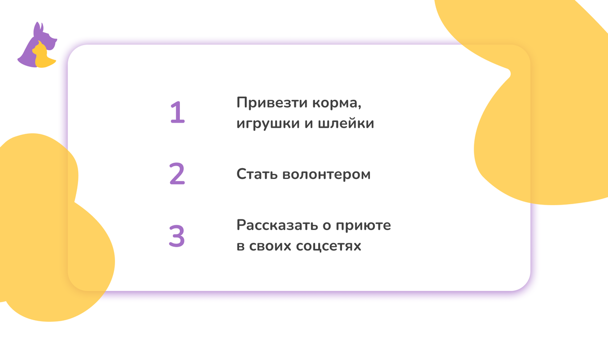 Вы можете привезти в приют корма, лакомства или вещи для животных, а также стать волонтером и помогать приюту делом. Если вы хотите попробовать себя в этой роли, напишите и мы расскажем, как присоединиться к команде и делать мир лучше. Привезти корма для животных Подойдет любой корм для кошек и собак. Наши пушистые друзья будут счастливы и лакомствам для животных. Стать волонтером У питомцев ежедневно нужно убираться в боксах, наливать чистой воды, кормить, чистить лотки. Собак нужно дрессировать и социализировать. В целом, мы будем рады любой помощи от вас! Помочь с пиаром в соцсетях Большинство наших подопечных нашли дом именно через интернет, люди заметили их в соцсетях. И такой пиар как раз по соцсетям очень важен. Это займёт 10-30 минут в день и подарит какому-то хвостику шанс найти дом. Для этого вам нужно иметь профиль ВКонтакте или канал в Телеграме. Отдать ненужное Игрушки для кошек, домики, вещевые контейнеры, в которых кошкам так нравится лежать. Много чего нужно в приюте,