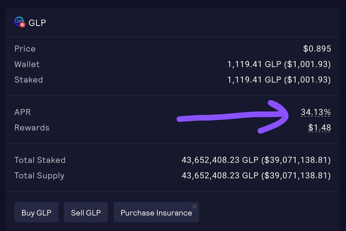 На фондовом рынке, это бы называлось дивидендами. Что такое дивиденды? Это когда компания делится своей прибылью со своими инвесторами, теми, кто держит их акции. Компании выплачивают их как квартально, в полгода, или за год, на каждую акцию. В сфере DeFi есть много схожих концепций, одна из которых это когда протокол делится вырученной прибылью с теми, кто предоставляет ликвидность или покупает токен ликвидности (Revenue share). Прибыль генерируется, например, от комиссий, полученных за торговую активность трейдеров на DEX бирже. Вот два примера такого пассивного заработка в DeFi. Помимо спотовой торговли, существует еще и торговля с плечом, где есть, например, ликвидация позиций. Исходя из принципа, что большинство трейдеров ошибается или больше теряет, чем зарабатывает, можно делать ставку и зарабатывать на этом до 30% годовых. ⏺ Пример номер 1: На платформе GMX, покупая токен GLP на их же площадке, вы получаете на данный момент 30%+ годовых в виде токена WAVAX (обвернутый AVAX), ко