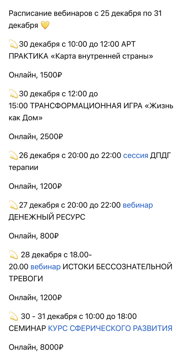 Расписание вебинаров с 25 декабря 2023 по 8 января 2024!!! 💫30 декабря с 10:00 до 12:00 АРТ ПРАКТИКА самопознания «Карта внутренней страны». ХИТ Онлайн, 1500₽ 💫30 декабря с 12:00 до 15:00 ТРАНСФОРМАЦИОННАЯ ИГРА «Жизнь как Дом» супер ХИТ Онлайн, 2500₽ 💫26 декабря с 20:00 до 22:00 сессия ДПДГ терапии (людям быстрого снятия негативного эмоционального состояния) Онлайн, 1200₽ 💫27 декабря с 20:00 до 22:00 вебинар ДЕНЕЖНЫЙ РЕСУРС Онлайн, 800₽ 💫 28 декабря с 18.00-20.00 вебинар ИСТОКИ БЕССОЗНАТЕЛЬНОЙ ТРЕВОГИ Онлайн, 1200₽ 💫 30 - 31 декабря с 10:00 до 18:00 СЕМИНАР КУРС СФЕРИЧЕСКОГО РАЗВИТИЯ Онлайн, 8000₽ 💫 2 января с 10.00-12.00 вебинар ИСТОКИ БЕССОЗНАТЕЛЬНОЙ ТРЕВОГИ Онлайн, 1200₽ 💫3 января -7 января 2014 с 12:00 до 14:00 МАРАФОН «Женщина-магнит» Онлайн, 1500₽ 💫2 января с 13:00 до 16:00 ТРАНСФОРМАЦИОННАЯ ИГРА «Жизнь как Дом» Онлайн, 2500₽ 💫2 января с 17:00 до 19:00 АРТ ПРАКТИКА «Карта внутренней страны» Онлайн, 1500₽ 💫3 января с 10:00 до 12:00 вебинар ДЕНЕЖН