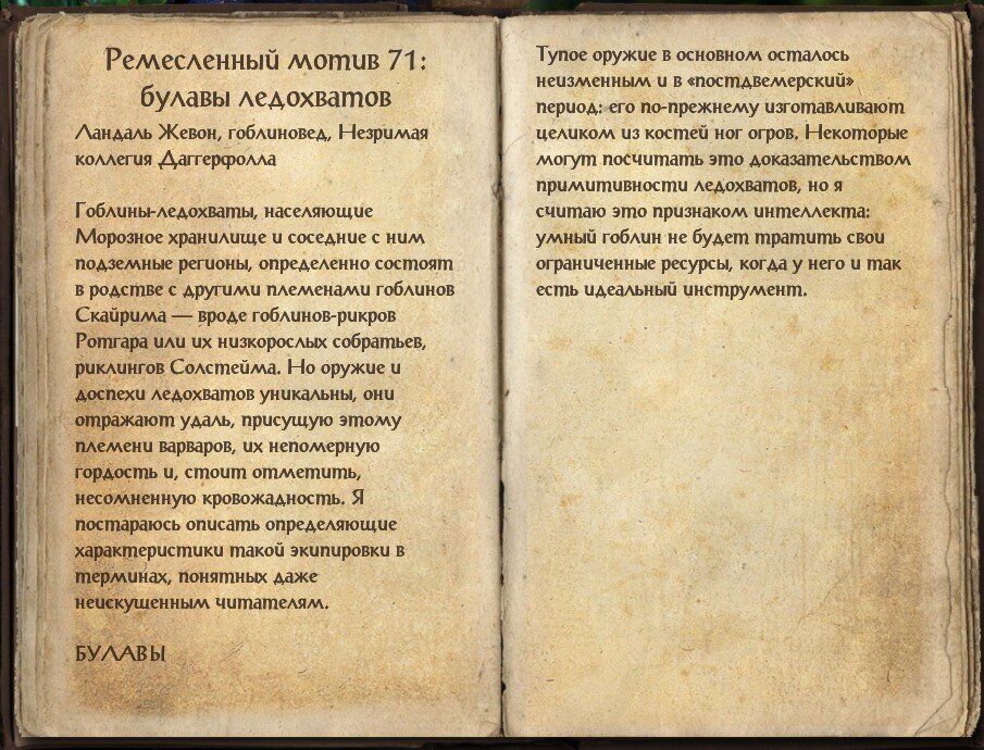 Гоблины- ледохваты, населяющие Морозное хранилище и соседние с ним подземные регионы, определенно состоят в родстве с другими племенами гоблинов Скайрима - вроде гоблинов-рикров Ротгара или их низкорослых собратьев, риклингов Солстейма. Но оружие и доспехи ледохватов уникальны, они отражают удаль, присущую этому племени варваров, их непомерную гордость и, стоит отметить, несомненную кровожадность. Я постараюсь описать определяющие характеристики этой экипировки в терминах, понятных даже неискушенным читателям.