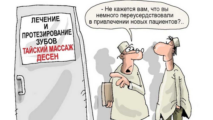 А теперь представь себе, что открывается дорогая и большая клиника, наняли в штат кучу персонала, зачастую не всегда нужного в виде различных «менеджеров», «кураторов», купили хренову тучу редкого оборудования, заказали дорогую рекламу. Думают, всё, сейчас попрет! А…чё-то не прет! Пациенты почему не звонят сотнями в день, не бегут на их акции, не приходят по холодным звонкам, не торопятся уходить от конкурентов. Та река бабла, на которую рассчитывало руководство почему-то оказалась тоненьким ручейком, который не перекрывает даже половину расходов. А расходы у нас о-го-го! Клиника же крутая! Тут главные сего заведения начали подозревать, что стоматология- это игра в долгую. Здесь рубить сразу сверхприбыли и при этом не обманывать людей практически невозможно. Во-первых, всё-таки большинство людей у нас идет, когда припрет, во-вторых, люди свойственно ходить в проверенные места, в-третьих, у основной массы людей может банально не быть денег на лечение в таких заведениях.