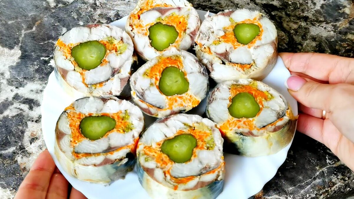 Затем мы слоями раскладываем обжаренные овощи, тертые яйца и маринованные огурцы на верхушку нашего рулета. Последний штрих – посыпать остатками желатина. Завершаем сборку, плотно заворачивая рулет и, возможно, несколько раз обворачивая его пищевой пленкой, чтобы сохранить его форму.