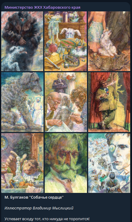 Самым милым ведомством Хабаровского края по праву можно назвать министерство ЖКХ. На удивление горожан, кроме постов о жизни региона, на официальном канале госоргана можно найти много культурного контента. Так, среди новых законов, высказываний известных политиков и рабочих поездок чиновников есть место и для поэзии. - Ведь ты единственный человек, с которым я могу говорить — об оттенке облака, о пеньи мысли и о том, что, когда я сегодня вышел на работу и посмотрел в лицо высокому подсолнуху, он улыбнулся мне всеми своими семечками, - цитируют в паблике строчки из книги Владимира Набокова «Письма к Вере». А несколькими днями ранее на канале разместили пост о другом писателе, Иване Тургеневе, и его произведении «Песнь торжествующей любви». - «Песнь торжествующей любви» — одно из поздних произведений Ивана Тургенева. Оно входит в цикл «таинственных повестей» — «Призраки», «Сон», «Клара Милич». Сюжет каждой книги рассказывает о мистических событиях. По сюжету за любовь девушки Валерии соп