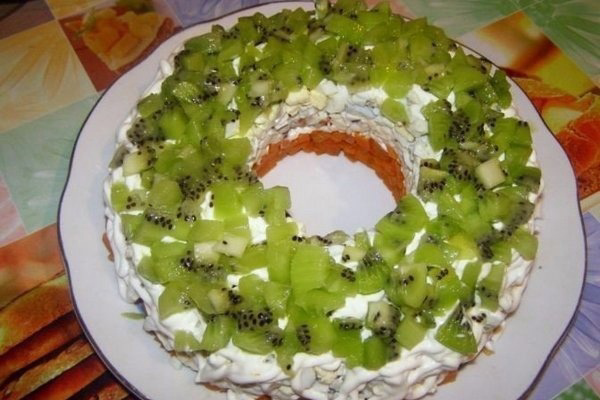 Ингредиенты: Приготовление: 1. Для приготовления такого праздничного салата нужно отварить куриную грудинку вместе с лавровым листом, с луковицей и черным перцем. 2. Варить ее нужно минут сорок пять, а еще лучше час. Отделить мясо от костей и разобрать его на волокна. Таким образом, салат получится нежнее. Необходимо вкрутую отварить яйца, очистить их от скорлупы, отварить картофель и морковь, варить их можно прямо в кожуре, остудить и очистить от кожуры. 3. Затем расплести сыр-косичку и мелко ее нарезать. Если Вам копченый сыр не нравится, то его вполне можно заменить сыром Российским или Голландским. Такой сыр нужно будет натереть на терку. Затем нужно разделить все продукты на две части. 4. Вместо кольца можно использовать банку из-под оливок. Установить банку в центре блюда. Вокруг этой банки аккуратно выложить половину куриного мяса и немного подсолить мясо. Каждый слой слегка притрамбовать. Поверх мяса натереть половинку картофеля, посолить и натереть половинку моркови. 5. Повер