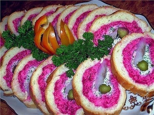 Оригинальная праздничная закуска– рулет. Ингредиенты: Приготовление: Готовим начинку. Плавленые сырки и яйца потереть на мелкой терке. Добавить к ним размягченное при комнатной температуре сливочное масло (но НЕ майонез!), хорошо размешать. Если сельдь не очень соленая, добавить соль, поперчить. Третью часть смеси отложить, добавив к ней мелко рубленную зелень. К оставшейся части смеси (это две трети) добавить отварную свеклу (а еще лучше - запеченную в духовке или СВЧ), натертую на мелкой терке, и все хорошо размешать. Сборка «шубы в шубке». Багет разрезать вдоль с одного бока так, чтобы он хорошо приоткрывался (как сундучок). Ложкой и рукой убрать мякиш, оставив стенки багета толщиной около 1 см. Обмазать багет внутри свекольной смесью, равномерно распределяя слой по стенкам.Поверх свекольного слоя внутри багета равномерно размещаем слой с зеленью. Можно добавить рубленый зеленый лук. Затем возле не разрезанной стороны выкладываем в линию корнишоны, рядом кладем филе сельди,