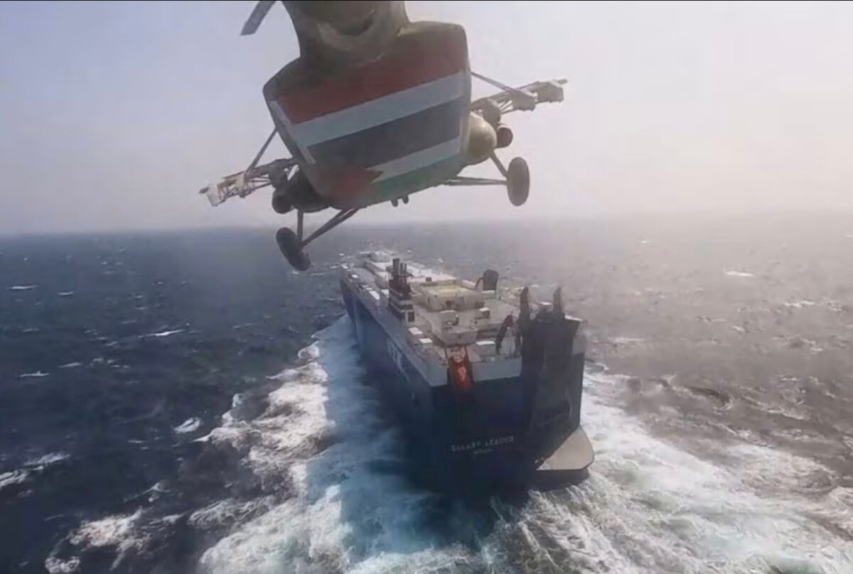 Западные эксперты считают, что атаки в Красном море и Индийском океане тщательно планируются и координируются, а вскоре могут быть расширены и на Средиземное море. На снимке, опубликованном 20 ноября 2023 года, военный вертолет хуситов пролетает над грузовым судном Galaxy Leader в акватории Красного моря. (Фотография предоставлена Houthi military media / handout.)