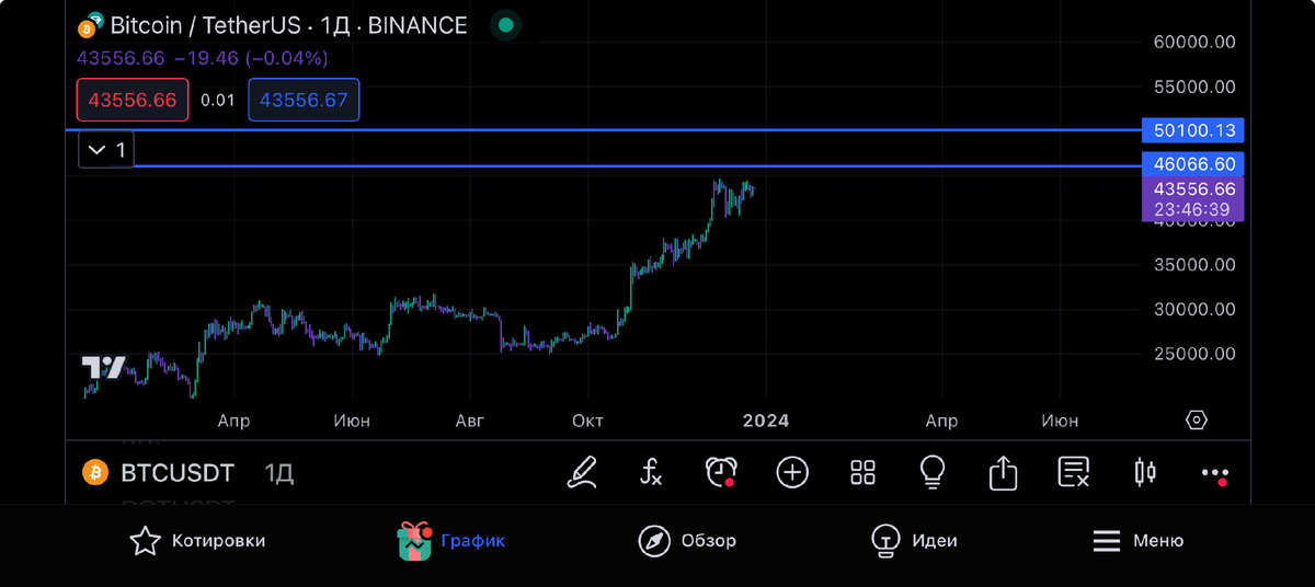 По битку так же жду 45000-46000 $ Потом закрепление над 48000$