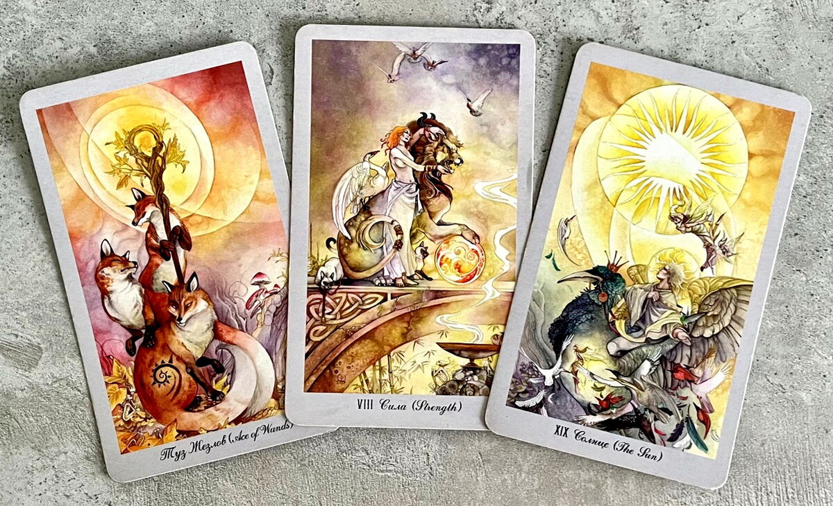 ВСЕМ МИР! С вами мастер Таро Маргарита Авилова. Какой шикарный триплет сегодня вышел! Каждая карта заряжена на счастливые события в вашей жизни, и это будет большой приятный сюрприз, подарок судьбы, которого вы, возможно, и не ждете, а он сам придет в ваши руки. Эта энергия многогранна, она может красиво развернуться результатом в разных сферах. В деловой жизни и финансах видно, что жизнь проявит щедрость, придет богатство в каком-то виде. Речь не про разовую удачу, грядет что-то серьезное. Солнце всегда включается с королевским размахом, оно одаривает золотом, наполняет пространство плодовитостью, изобилие само идет к вам мощным потоком. Здесь читаются и большие деньги, и подарки, которые выражают вашу значимость, признание заслуг, важность, достойность во всех смыслах. Аркан Сила этот поток уСИЛивает - приумножает дары многократно. А туз жезлов - это элемент неожиданности, спонтанности. Вы испытаете яркие эмоции, когда это случится - огонь пробежится по венам, радость будет рв