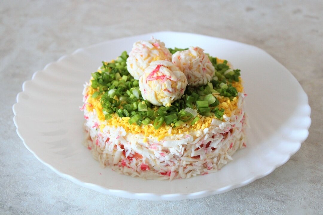 Сегодня поделаю рецептом очень вкусного слоеного салат, который возможно кто-то не знает, а кому-то он хорошо знаком. Нам очень нравится. Ингредиенты все самые обычные, но они интересно считаются между обой. Для приготовления салата нужно заранее отварить яйца, все остальное не требует подготовки. Каждый слой я промазываю тонким слоем майонеза. Белки яиц нужно натереть с помощью крупной терки и уложить на дно тарелки. Далее слой из помидоров. Томаты нужно предварительно очистить от семян и сока чтобы салат не получился водянистым. Помидоры нужно нарезать мелкими кубиками. Крабовые палочки я тоже натираю с помощью крупной терки и укладываю на помидоры. Следующий слой - сыр, так же натертый на терке. Я использую нейтральный по вкусу, например "Пошехонский". Сверху на сыр остается выложить натертые с помощью мелкой терки яичные желтки. Для яркости и пикантности можно украсить салат зеленым луком. Лук можно заменить на петрушку, но тогда не будет той характерной "остринки", которая в этом