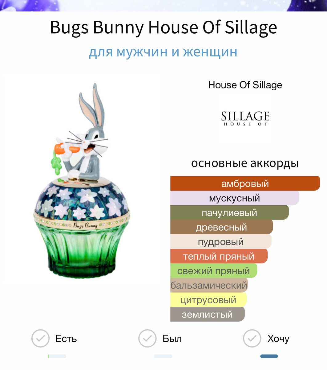 Итак, новинками под Новый год 🎄 порадовали своих поклонников премиальные ароматы House Of Sillage. Честно, никогда к ним не подходила даже. Видела простую пирамиду и меня это останавливало и плюс цена, хотелок и других много, но я также понимала, что инкрустированные камнями Сваровски крышечки и напыление золотом, ну априори, не может стоит бюджетно. Поэтому флакончики-кексы так и не нашли место пока в моем парфюмерном гардеробе. Но кто знает…Видя их заигрывания с кинематографом, и создание новых ароматов 2023, как минимум призывно влечет меня к знакомству. Первый аромат, за который зацепился мой глаз - это Кролик Багз Банни 🐇. Зная нашего персонажа, мы ожидаем услышать аромат в оптимистическом ключе. Багз Банни - это персонаж, который не боится трудностей, легко выкручивающийся из любых жизненных ситуаций. В нотах ждём корень ириса и морковку, возможно циветту, ан нет, Фрагрантика нам показывает совсем другие ноты: Вторым интересным ароматом, посвященным также кино является Wonder