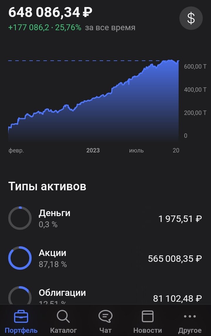 Ставьте лайк и Подписывайтесь на канал в дзене и на мой телеграмм канал. ✔️Прирост портфеля составляет 25,76% 🕯 ⚠️ Есть дисбаланс между акциями и облигациями! ⚠️ Планирую иметь баланс 80%/20% или 70%/30% (акции /облигации) из-за сильного роста акций в этом году сейчас отношение 87%/12% ➕ ждём поступления дивидендов от: ⛽️ Лукойл 🌾 ФосАгро 💿 Норильский никель ⛽️ Газпромнефть ⚓️ Совкомфлот 🎛Европейская Электротехника 🍷НоваБев Групп (Белуга) ⛽️ Роснефть ⛽️ Татнефть Более подробный состав портфеля 👇👇👇 Ставьте лайк и Подписывайтесь на канал в дзене и на мой телеграмм канал. Планы: Пока высокая КС буду покупать длинные ОФЗ цена которых увеличится при снижении КС в будущем и можно будет заработать на теле облигации 20%-30%🔝 Благодарю за внимание. Всем благ и зеленых портфелей! Ставьте лайк и Подписывайтесь на канал в дзене и на мой телеграмм канал. ‼️➡️ в комментариях💬 👇👇👇расскажите о ваших планах на будущие покупки 👇👇👇