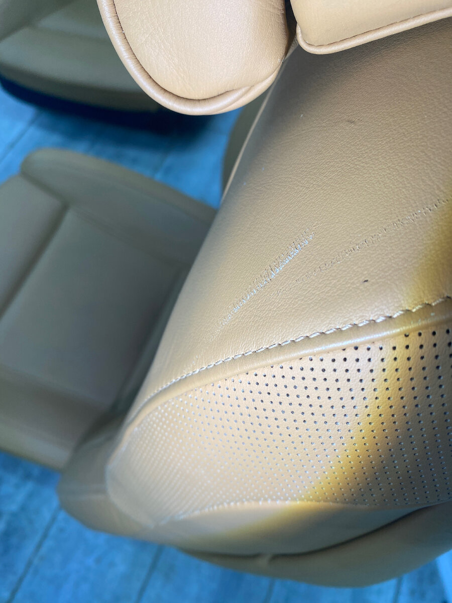 Иногда на сидениях есть мелкие царапки, зацепки, потертости. Для этого можно локально устранить повреждения, не перекрашивая полностью элемент. Такое часто случается при ремонте в салоне автомобиля, или при замене салона авто. Нужно так же почистить кожу, обезжирить ее. Зашкурить места ремонта. Если нужно, то зашпаклевать какие-то царапины. Подбираем цвет. Сложность этого цвета в том, что при смешивании красок теряется насыщенность цвета. Наносим базу для краски с отвердителем. Наносим несколько слоев краски. Наносим слой лака с отвердителем.