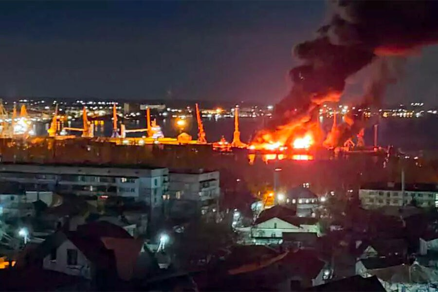 Один человек погиб, двое ранены в результате ночной атаки ВСУ на Феодосию, сообщил глава Крыма Сергей Аксенов. В результате удара, по данным Минобороны РФ, также получил повреждения большой десантный корабль «Новочеркасск». Украина тоже понесла потери — были сбиты два Су-24, которые запустили управляемые ракеты по порту города. Подробности — в материале «Газеты.Ru». Сообщение о ночной атаке близ Феодосии начали появляться в Telegram-каналах около 3:30 мск. Shot написал о громких взрывах над городом и работе системы ПВО. «Было слышно несколько хлопков в районе порта, после этого в небе появились следы дыма», — говорится в посте со ссылкой на очевицев. В 4:16 о «вражеской атаке» сообщил глава Крыма Сергей Аксенов: «Территория порта оцеплена. На данную минуту детонация прекратилась, пожар локализован». Руководитель региона добавил, что жители нескольких близлежащих домов будут отселены. На месте происшествия работают профильные службы, а он лично контролирует ситуацию. Пострадавшие и повр