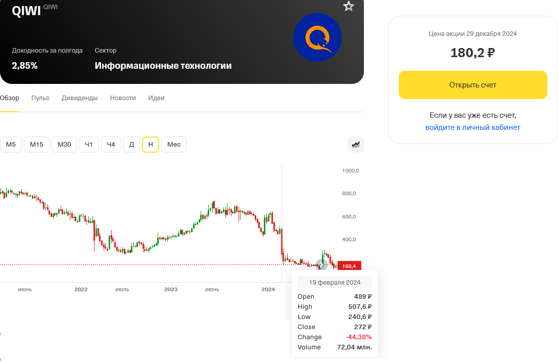 К началу 2024 года компания QIWI подошла с решением, что ей надо срочно разделять бизнес на российский и международный, чтобы ей разрешили сохранить листинг на NASDAQ и MOEX. В начале 2024 года были озвучены условия раздела, согласно им сам банк будет выкуплен экс-главой QIWI Андреем Протопоповым за 23,75 миллиардов рублей, причем сразу была озвучена оплата в рассрочку. Все это выглядело как большой кидок миноритариев из России. Инвесторам не понравился данный план и котировки компании обвалились. Хотя надо сказать честно, акции данной компании инвесторов редко радовали своим ростом.