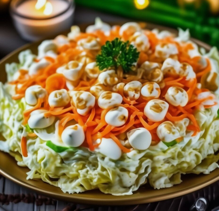 Представляю вам салат с кальмарами и овощами – вкусное сочетание кальмаров, пекинской капусты, моркови по -корейски и яиц. Этот салат прост в приготовлении, но богат на вкусовые оттенки. Свежесть и сочность ингредиентов гарантируют настоящее удовольствие от каждого кусочка. Попробуйте и насладитесь вкусом кальмарового салата. Приготовление салата из кальмаров с овощами: Очищенные кальмары опустить на 2-3 минуты в кипящую воду, достать. охладить. Нарезать произвольно. Пекинскую капусту нашинковать. Яйца очистить и нарезать. Соединить в салатнице нарезанные ингредиенты, добавить морковь по-корейски, консервированную. кукурузу, заправить майонезом, при желании посолить по вкусу. Хорошо перемешать и всё. Салат готов. Ингредиенты: 500гр кальмаров 200гр консервированной кукурузы 200гр моркови по-корейски 4 вареных яйца 200гр пекинской капусты соль, майонез Количество ингредиентов вы можете добавлять по своему вкусу. Ведь на кухне у каждого есть возможность экспериментировать и проявлять св
