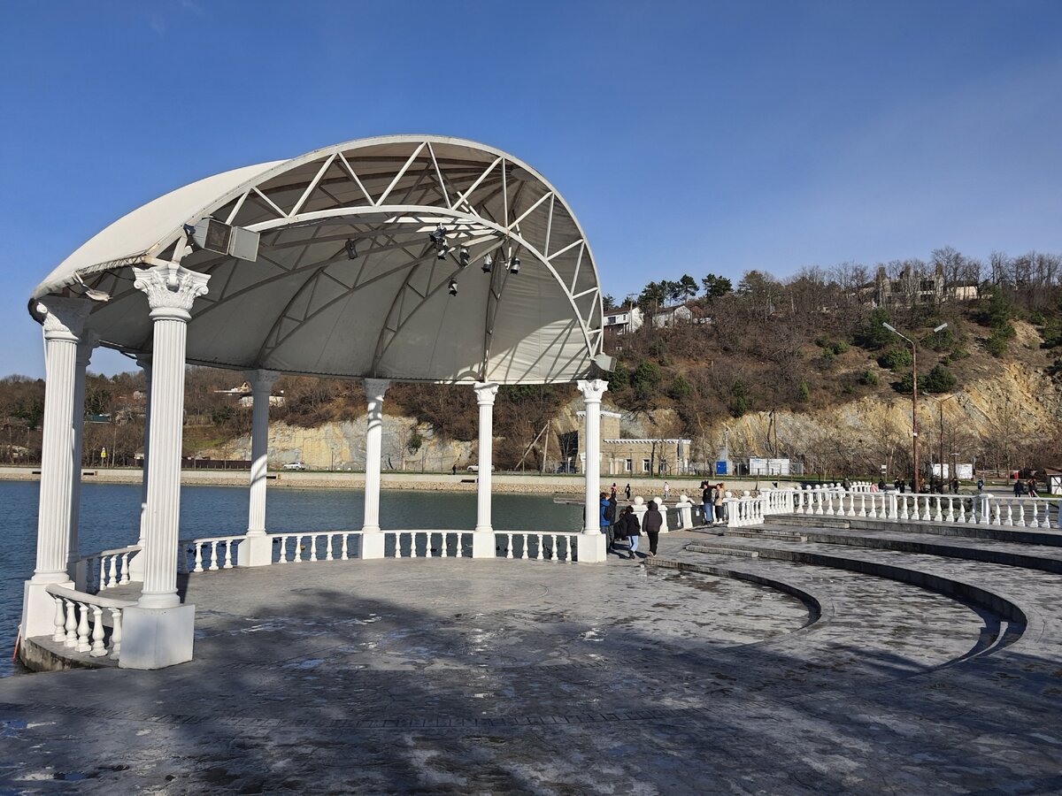 Мы приехали в Абрау Дюрсо второй раз и опять в декабре. Сегодня нас радует очень теплая погода: интернет говорит, что плюс 13. Но на солнышке при отсутствии ветра по ощущениям около плюс 20. Предыдущие заметки о Абрау Дюрсо Естественно мы нашли ближайшую скамейку с видом на озеро и расположились с комфортом и прекрасным настроением. Немножко погодя отправились на прогулку по парку. Вот такая оригинальная лавка-диван с вырезанными контурами винных бутылок -- оригинальное решение для дизайна просто скамьи. Прогулочный пароходик. Жаль, что зимой прогулок нет. В хорошую погоду прекрасно! Набережная парка быстро заканчивается. Он небольшой сам по себе. Набережная и три аллейки. В парке есть парочка инсталляций. Я бы не сказала, что они очень интересные, но оживляют пейзаж точно. Вечнозелёные растения. Такое ощущение, что на секунду мелькнуло лето. Вторая инсталляция. Парк кажется большим. Декоративная капуста. Качели. Очень красиво отделано здание вин.завода. -- деревянными палетами, где