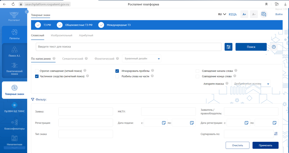 Роспатент запустил новый удобный сервис для поиска и проверки по зарегистрированным товарным знакам. Данный сервис позволяет бесплатно и круглосуточно получать любым лицам сведения о зарегистрированных в РФ товарных знаках и знаках обслуживания, а также об общеизвестных и международных товарных знаках. Искать обозначения можно для анализа их степени смешения по написанию, изображению (можно загрузить картинку), смыслу (для словарных слов) или звучанию. Поиск можно также отфильтровать по заявке, правообладателю, Международной классификации товаров и услуг для регистрации знаков, и т.д.