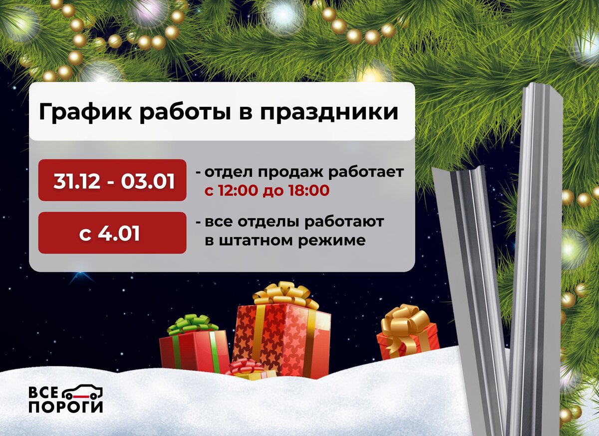 Поздравляем всех с наступающим Новым годом! Надеемся, что все успели успешно завершить ремонт авто и другие свои дела в этом году. Ниже — информация по нашему графику в праздничные дни. Выходные дни: с 31 декабря по 3 января. В эти дни заказы не принимаются и не отправляются. Забрать заказ самовывозом в указанные даты также нельзя. Рабочие дни: до 30 декабря включительно. Начало работы в 2024 году: 4 января. С этого дня мы принимаем и отправляем заказы, их также можно забрать самовывозом. Все вопросы по отправкам, заказам и доставке можно будет задать до 30 декабря или с 4 января по телефону 8 800 200 21 59 (добавочный 2). Оформить детали — по тому же номеру, но добавочный — 1. Желаем вам ярко встретить Новый год! Успехов в 2024.
