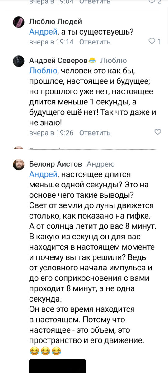 Многие говорят, что нужно жить в настоящем, что жизнь - сосредоточена в одном мгновении. Но это неправда. Слово можно записать в голосовом сообщении утром и отправить человеку, а он прослушает его вечером. И где здесь настоящее? То, что Вы называете мгновением, РАСТЯНУТО НА ВЕЧНОСТЬ ВСЮДУ, ЧТО СЧИТАЮТ СТОРОНАМИ ПРОСТРАНСТВА. ЭТО И ЕСТЬ ОБЪЕМ. Объем вселенной - это её размер, это свет, ищущий от дальних галактик к нам миллиарды лет. Настоящее - это миллиарды лет, это вечность. А не мгновение. И в нем же содержится и прошлое и будущее.