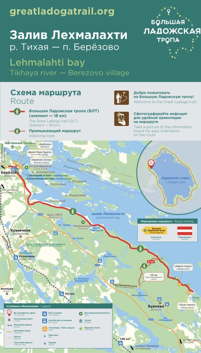Первый раз мы дошли до первого створа (км пять примерно), т.к. искали метки и верили в логику организаторов этой тропы. Зря. Во второй раз шли четко вдоль Ладоги и в очевидных местах действительно присутствовали метки. Это просто значки на деревьях или камнях. Никаких табличек, где Вы находитесь, куда идти, сколько до точки финиша и т.д. нет и в помине. Как и организованных мест для отдыха. Вдоль всей тропы много палаточных лагерей как основательных, так и снимающихся после стоянки. Я никак не могла понять, почему все заканчивают в разных местах и в районе Кузнечного, ведь финишь заявлен в поселке Березово. И была настроена дойти именно до него. Но!!!! Выйдя в тупичок жд путей видимо Гранита-Кузнечного поняла, что знаков и тем более указателей больше нет и не будет. Сторож смеясь сказал, что тропа тут и заканчивается, а если хотите в Березово, то шуруйте по старой асфальтированной дороге. Так мы пошли. Думали, что в таком месте точно будет указатель, куда идти. Опять зря. Пройдя