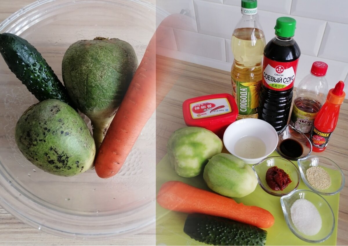 Доброго времени суток)) Если вам нравится острая азиатская еда, и вы не боитесь специфических восточных запахов, предлагаю приготовить салат из зелёной редьки. Готовится он очень быстро и просто. Набор продуктов: Основной ингредиент этого салата – зелёная редька. Огурец и морковь нужны для украшения, ну и для того, чтобы немного разнообразить вкус блюда. Огурец можно заменить на редис, будет тоже очень красиво, и также вкусно. А вот зелёную редьку заменять ничем не советую, для этого салата подходит только она. Огурец режем тонкими кружочками, толщиной 1,5-2 мм, зелёную редьку - небольшими тонкими дольками. Нарезка огурцов и редьки должна выглядеть однородной по величине, чтобы было красиво)) Огурцы и редьку нужно положить в отдельные ёмкости. Морковь натираем на корейской тёрке, если её нет, придётся немного потрудиться) Сначала режем овощ тонкими кружочками под углом 45 градусов, а потом соломкой. Морковь добавляем в ёмкость к редьке. В огурцы добавляем чут
